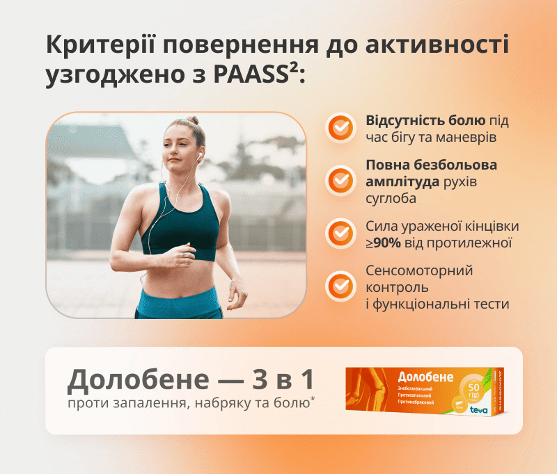 - Кріотерапія – короткими сесіями для знеболення як допоміжна опція; не використовувати рутинно як «протизапальне лікування».