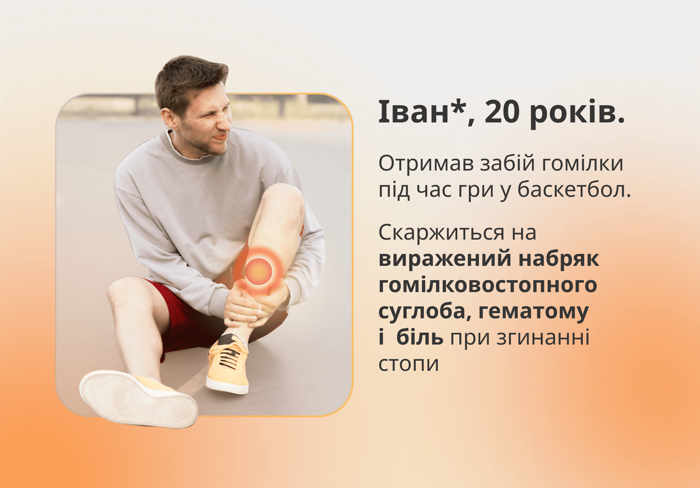 Івану потрібне не лише потужне знеболення – важливо також швидко зменшити набряк і гематому, щоб якнайшвидше повернутися до звичного способу життя.