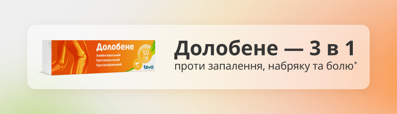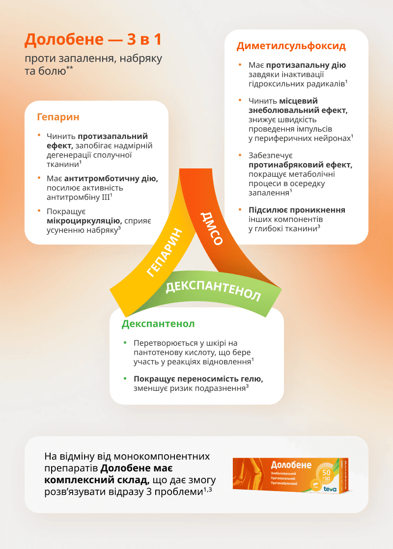**Згідно з інструкцією гель Долобене має протизапальну, місцеву знеболювальну та протинабрякову дію1.