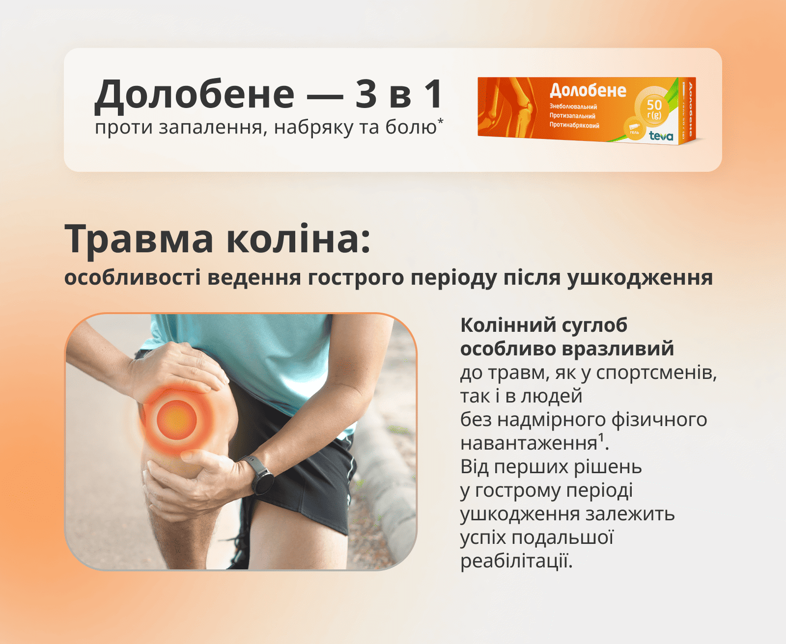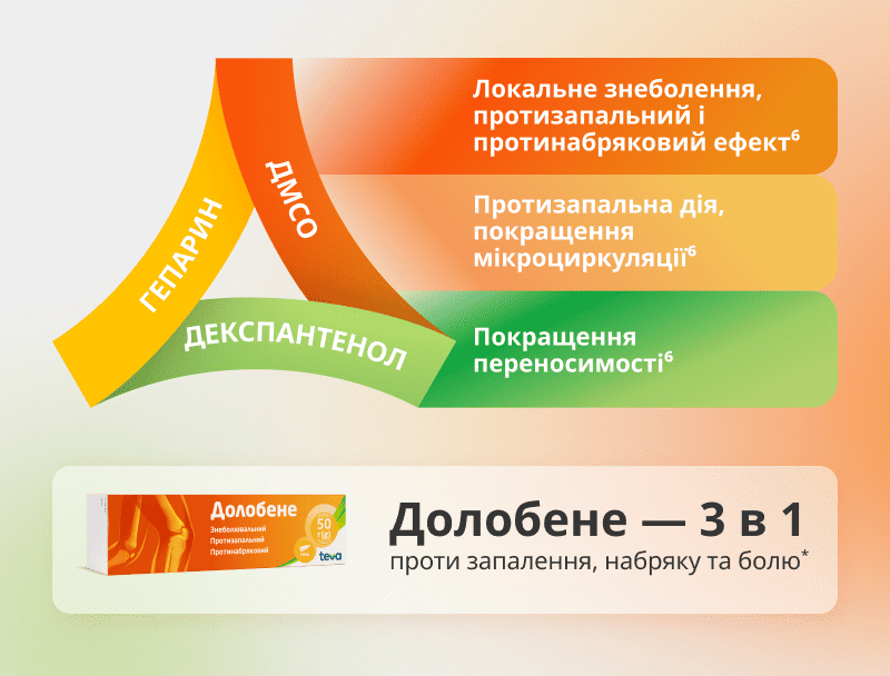 Долобене гель – комбінований препарат, показаний для лікування травм (зокрема, спортивних), гематом, ушкоджень м’язів та периартикулярних структур6.