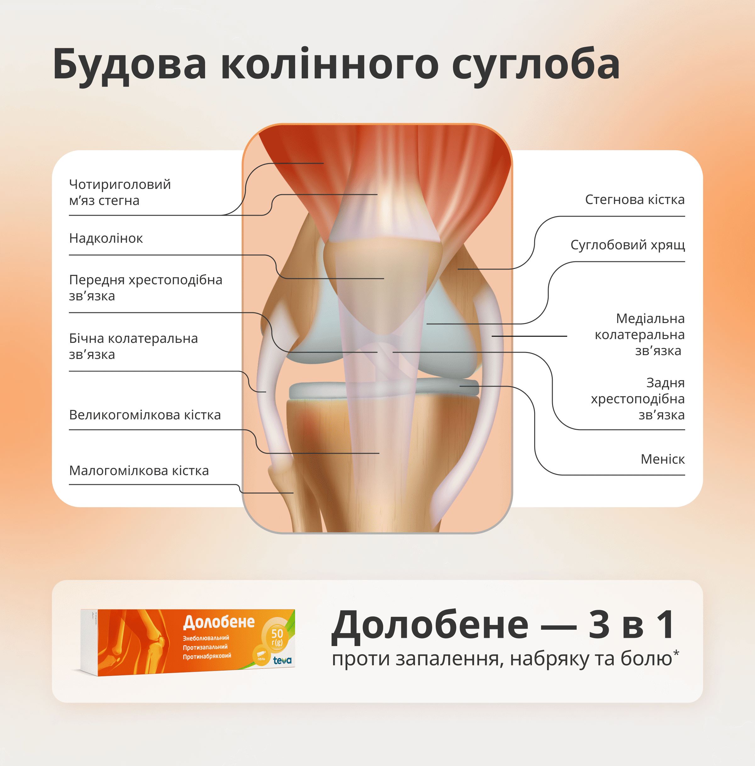 Травми колінного суглоба становлять 10 – 25% усіх ушкоджень опорно-рухового апарату. У більшості випадків ідеться про ушкодження м’яких тканин – забої, розтягнення зв’язок, пошкодження менісків, вивих надколінка1,2. Це пов’язано, зокрема, з функціональними особливостями колінного суглоба1-3: