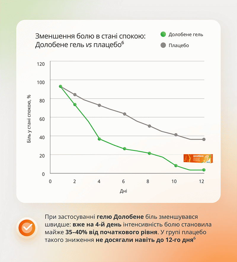 У спортсменів із гострими травмами м’яких тканин Долобене гель у складі комплексної терапії сприяв швидшому зменшенню болю**11.