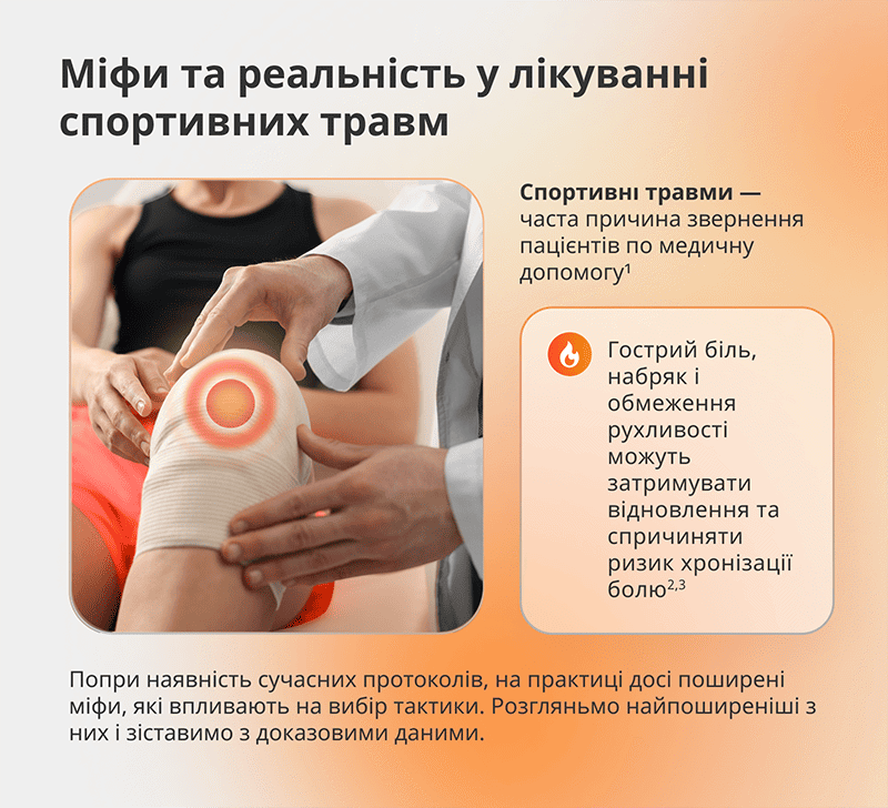 Однак у клінічних умовах короткі курси НПЗП не асоціюються з підвищенням ризику значущого погіршення загоєння4. Навпаки, адекватний контроль болю дозволяє раніше розпочати реабілітацію, що позитивно впливає на результат і є важливим у спортивній медицині5.