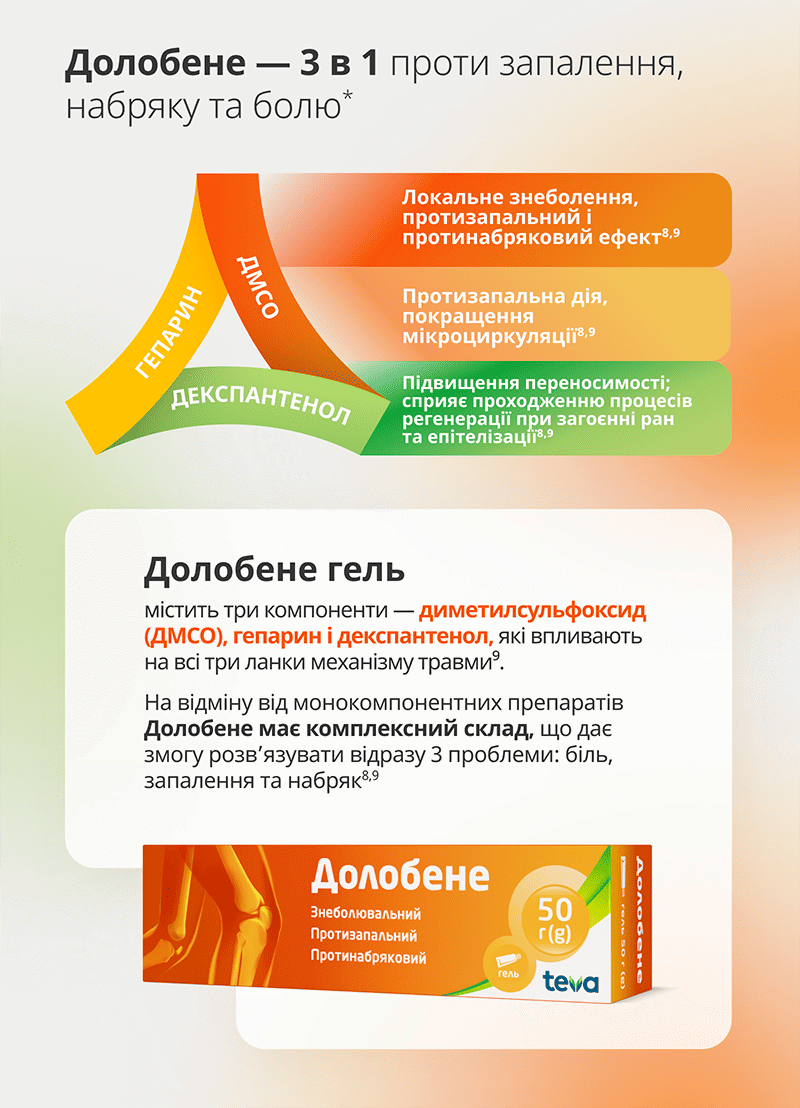 ** Згідно з інструкцією гель Долобене має протизапальну, місцеву знеболювальну та протинабрякову дію9.