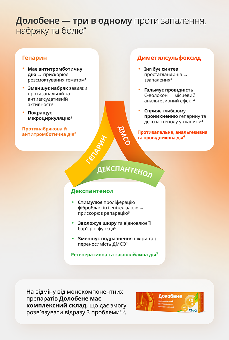 Долобене гель містить три компоненти – диметилсульфоксид (ДМСО), гепарин і декспантенол, які впливають на всі три ланки механізму травми3.