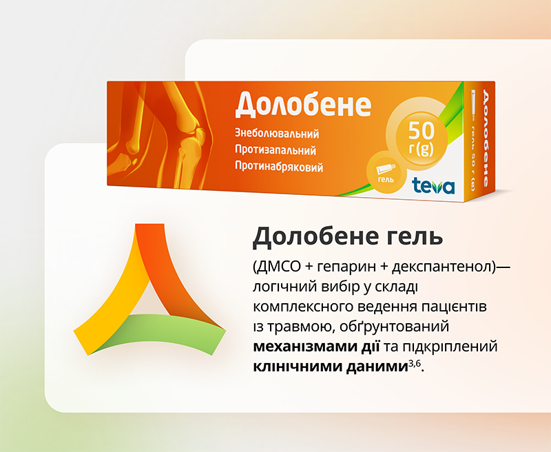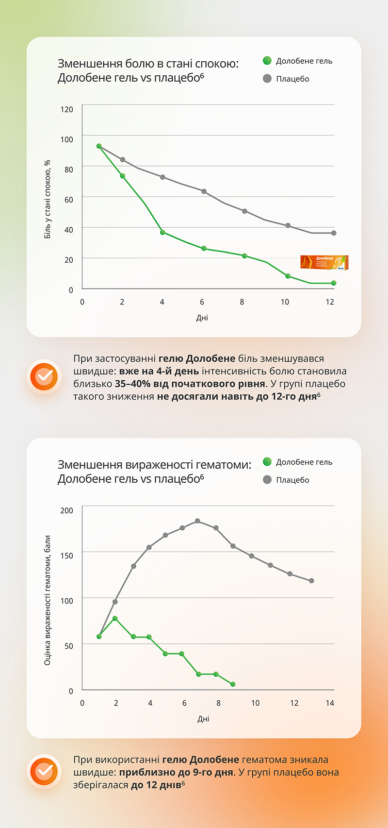 У спортсменів із гострими травмами м’яких тканин Долобене гель у складі комплексної терапії сприяв швидшому зменшенню болю і розсмоктуванню гематом**6.