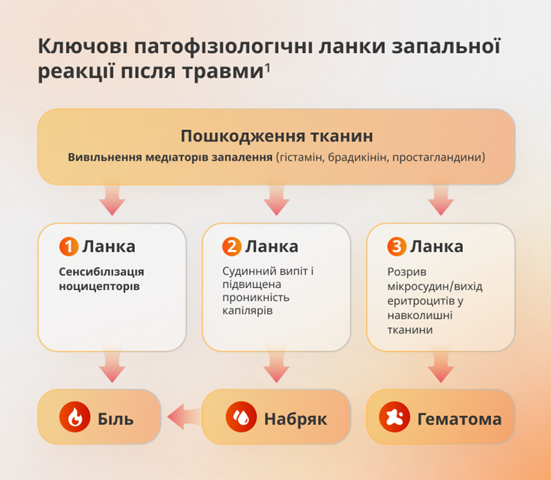 Після травми м’яких тканин часто з’являються одночасно три ключові прояви – біль, набряк і гематома, які об’єднує спільний патогенетичний механізм – гострий запальний каскад1.