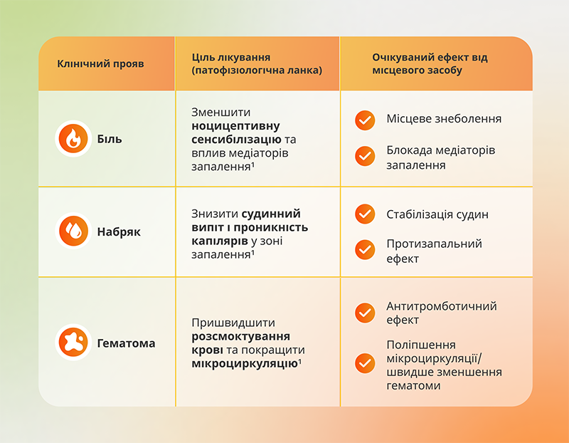 Оскільки біль, набряк і гематома виникають одночасно, місцева терапія має впливати на всі три ланки запального каскаду. Розгляньмо цілі лікування та очікуваний ефект.