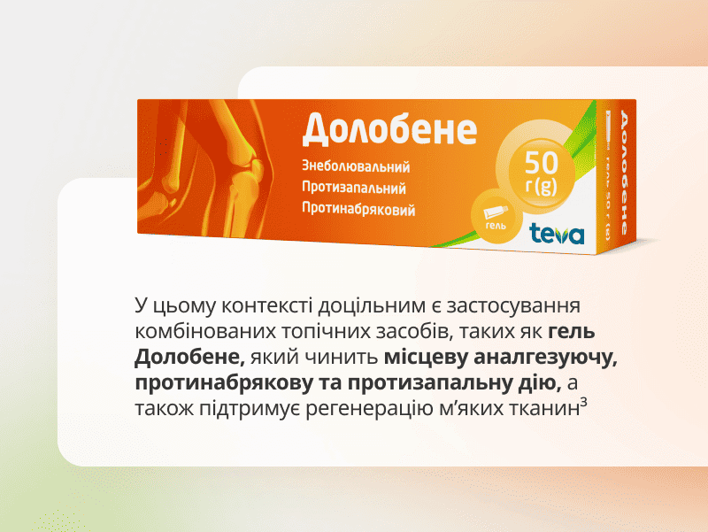 Окрім короткочасного застосування анальгетиків, важливо спрямувати терапію на зменшення запалення і набряку, що є ключовими компонентами післятравматичної відповіді2.