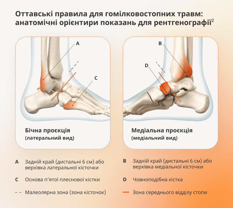 Для оцінювання травм нижніх кінцівок застосовуйте Оттавські правила (Ottawa Ankle Rules). Це клінічна стратегія, що допомагає вирішити, кому потрібна рентгенографія при гострих травмах гомілковостопного суглоба та середнього відділу стопи2.