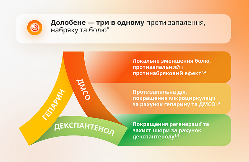 Долобене гель має комплексний склад і на відміну від монокомпонентних препаратів відразу діє на основні прояви травми — набряк, запалення, біль — і водночас підтримує відновлення м’яких тканин³.