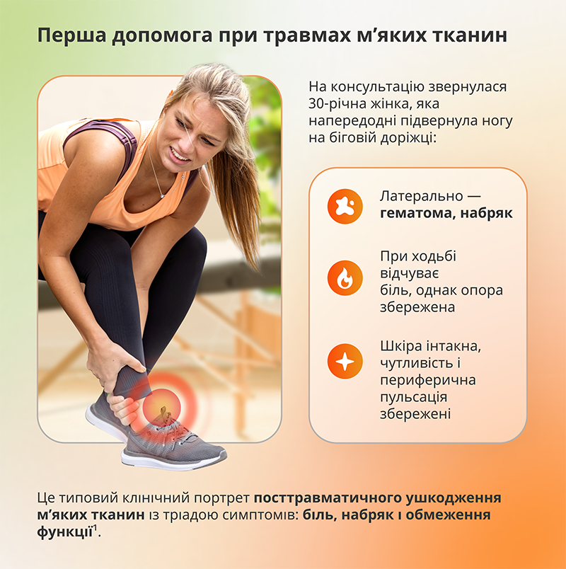 Перший крок у лікуванні травми — режим відновлення (зменшити навантаження, підняти кінцівку, носити еластичну пов’язку) та місцева терапія¹. Важливо вибрати засіб, який діє на тріаду симптомів і сприяє відновленню м’яких тканин.