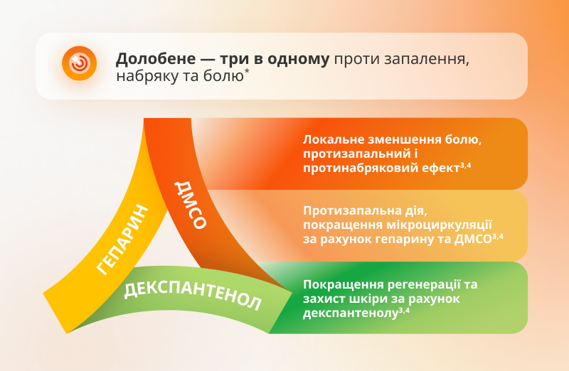 Долобене гель має комплексний склад і на відміну від монокомпонентних препаратів відразу діє на основні прояви травми – набряк, запалення, біль – і водночас підтримує відновлення м’яких тканин³.
