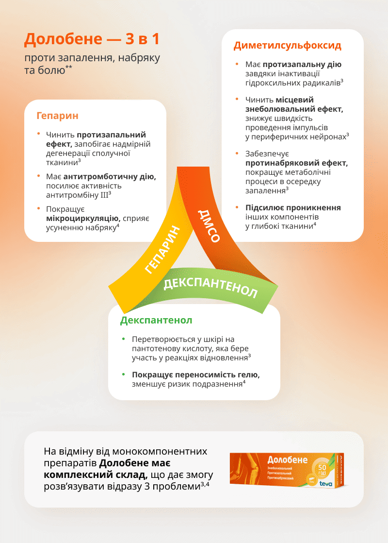 **Згідно з інструкцією гель Долобене має протизапальну, місцеву знеболювальну та протинабрякову дію2