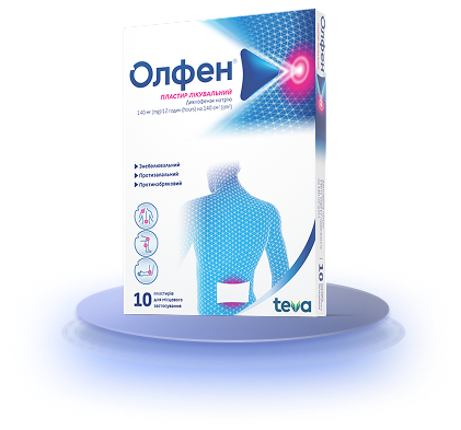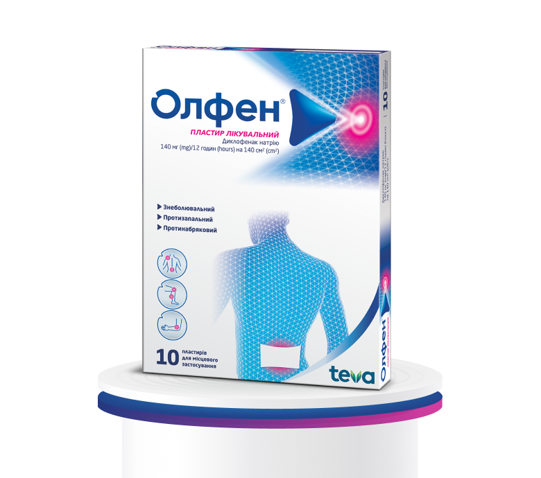 ОЛФЕН® пластир лікувальний – трансдермальний диклофенак, що поєднує ефективність, кращий профіль безпеки і зручність у щоденному застосуванні. Препарат містить 140 мг диклофенаку натрію і забезпечує стабільне його вивільнення до 12 годин5.